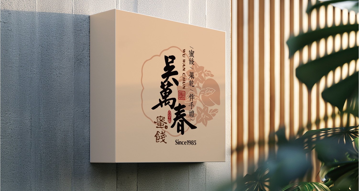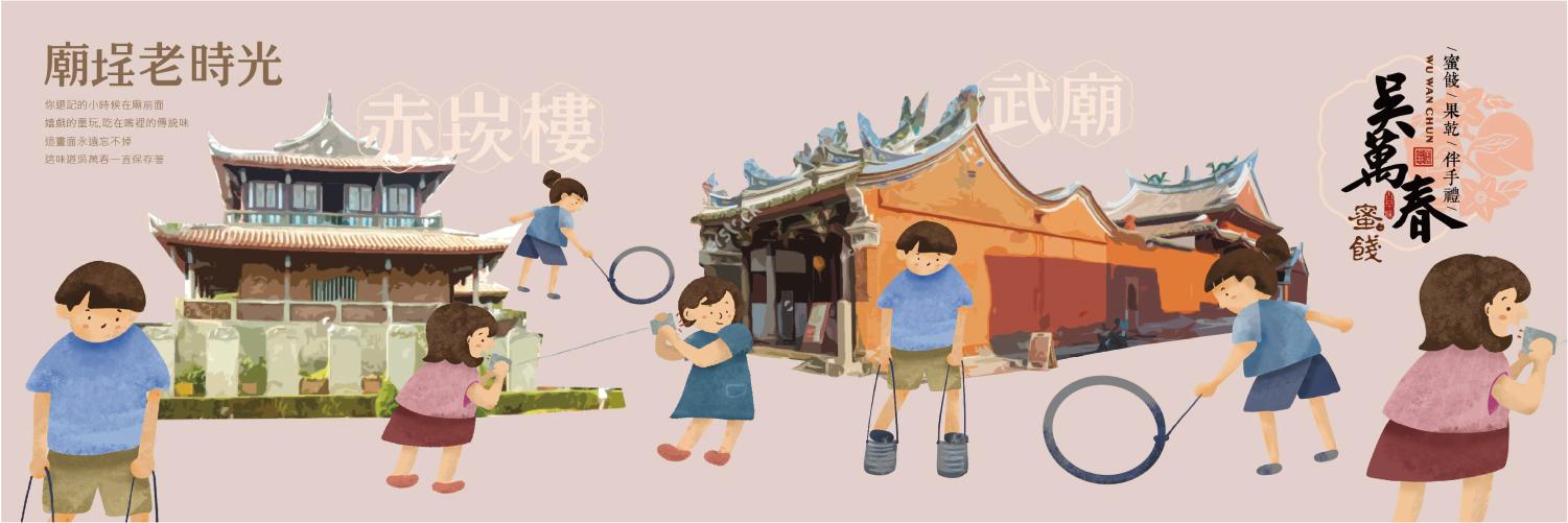 本設計緊扣「吳萬春蜜餞」位處武廟和赤崁樓商圈的地域特色,以懷舊插畫帶領觀者回到舊時光。