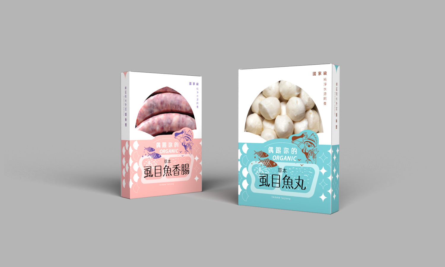 整體風格追求高雅中帶點可愛:運用柔和的粉紅與湖水藍色調,搭配親切的手繪魚圖案和浪花意象,傳達出純淨、天然的品質,同時兼顧視覺的活潑度與親和力。