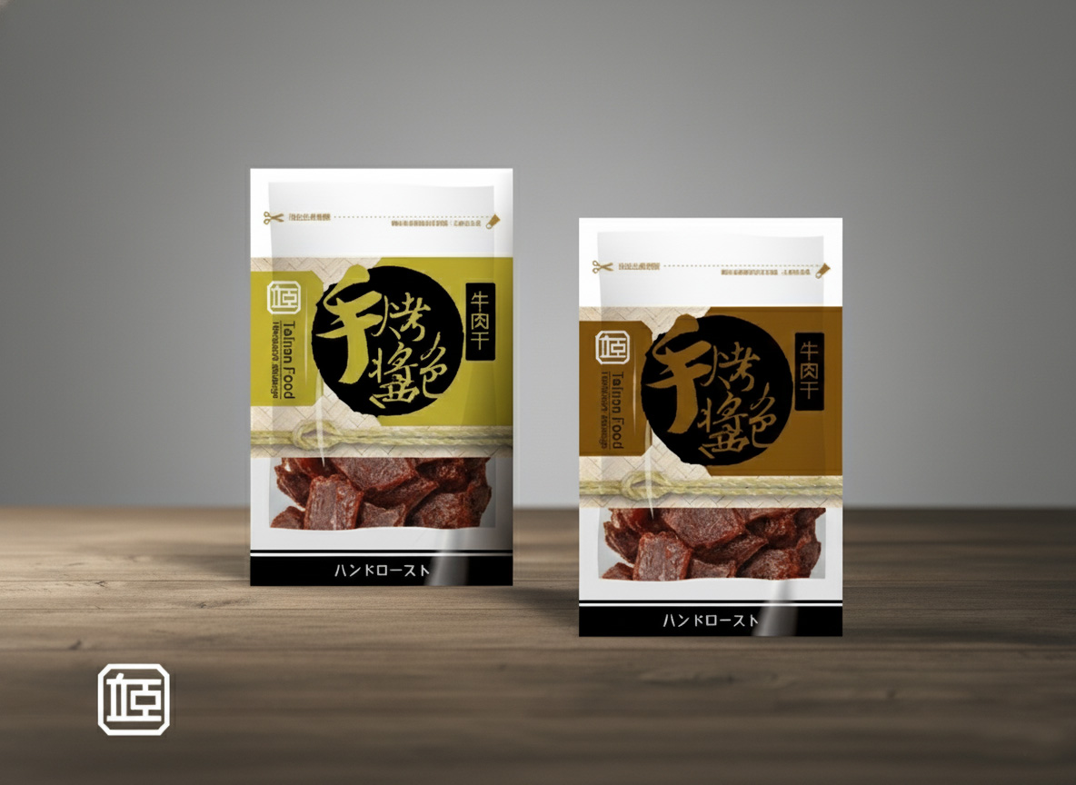 包裝上半部運用深沉的醬色或芥末黃,搭配狂放的書法字體,營造出濃厚的日式風味與職人精神,讓人聯想到手烤肉品經年累月累積的醬汁精華。