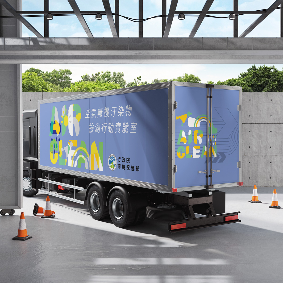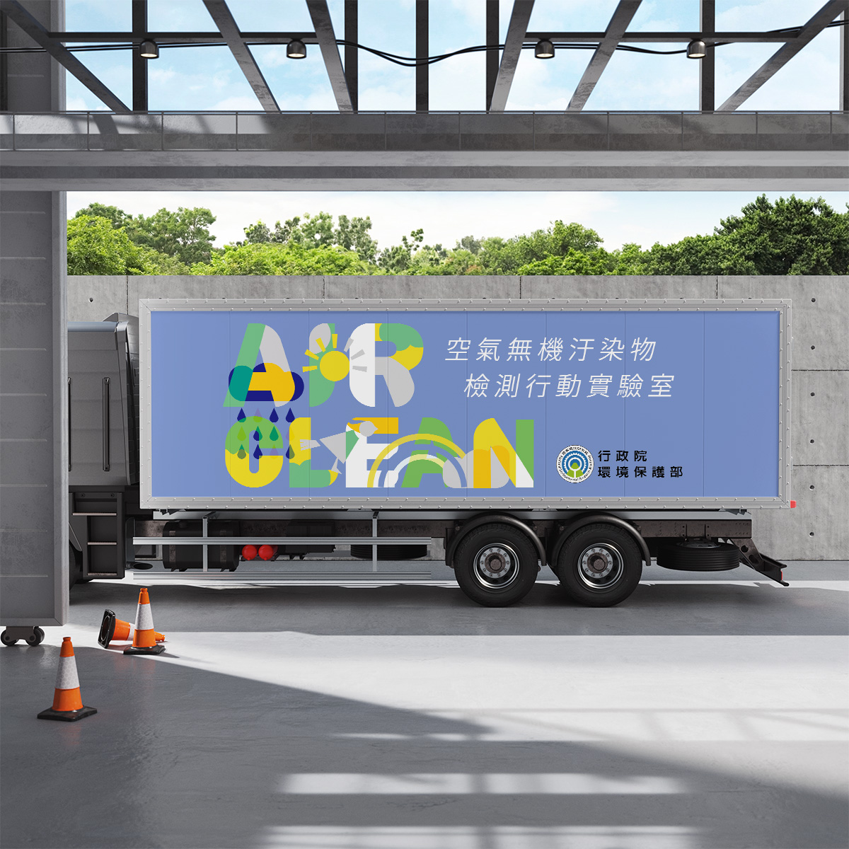 本設計以「AIR CLEAN」為主題,將文字結合太陽、雨滴、彩虹等氣象符號,象徵空氣的多樣與潔淨循環。整體以亮麗藍色為底,搭配清新黃、綠、白等色調,營造自然與科技並重的氛圍。設計傳達環保行動實驗室的專業形象,同時展現守護清淨空氣的積極態度與視覺親和力。