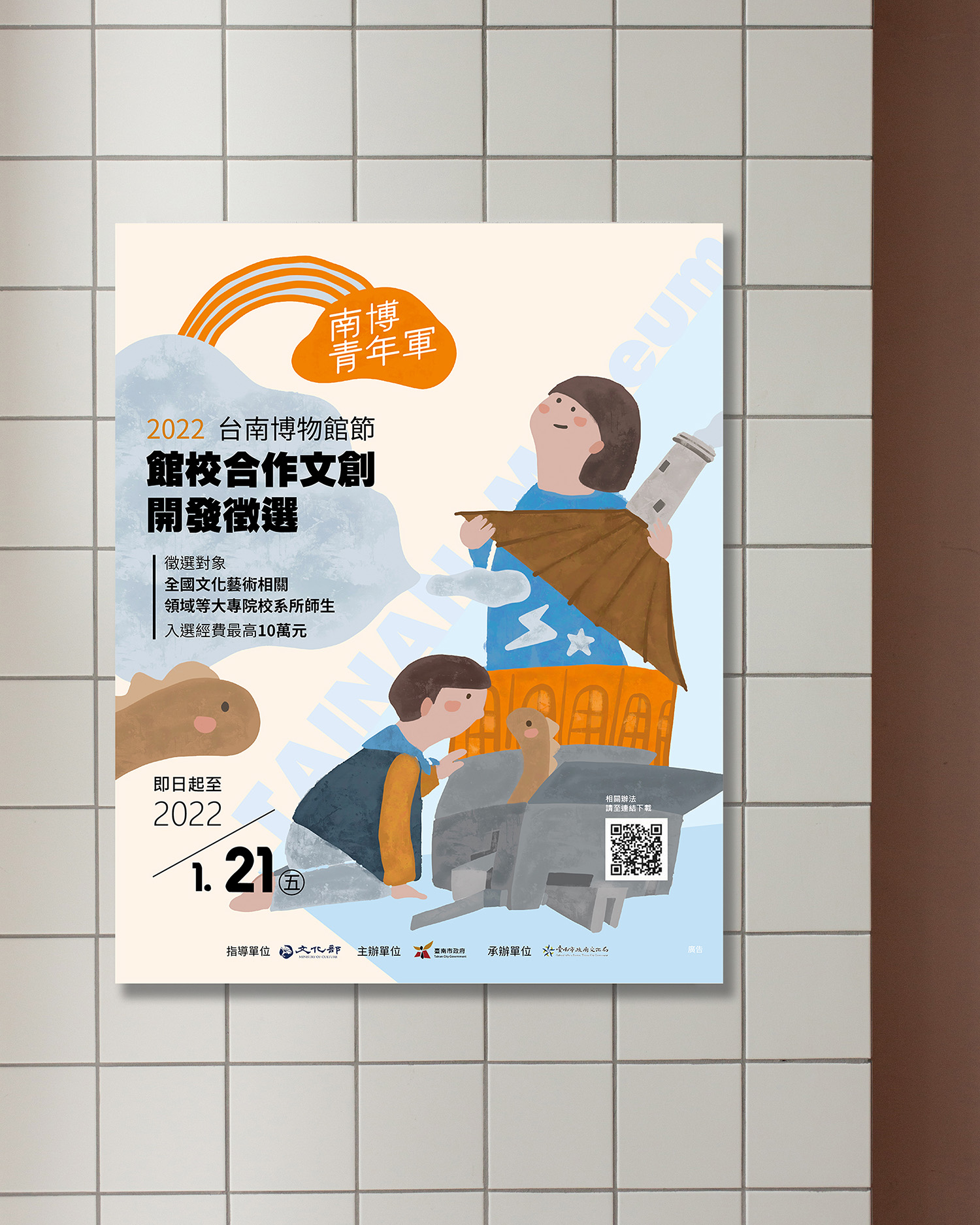 柔和的橘色調與活潑的構圖,突顯南博青年軍活動的創新與熱情,鼓勵年輕學子加入,共同激發文創火花。