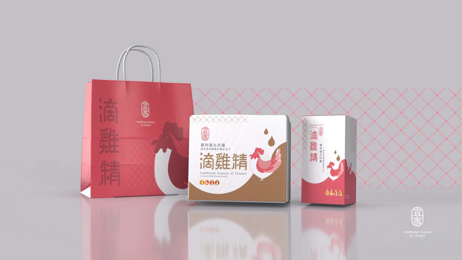 運用圓弧曲線分割版面,柔化視覺,營造親切感,同時巧妙地融入滴落的雞精精華滴圖案,直觀地展示產品的濃縮營養價值。