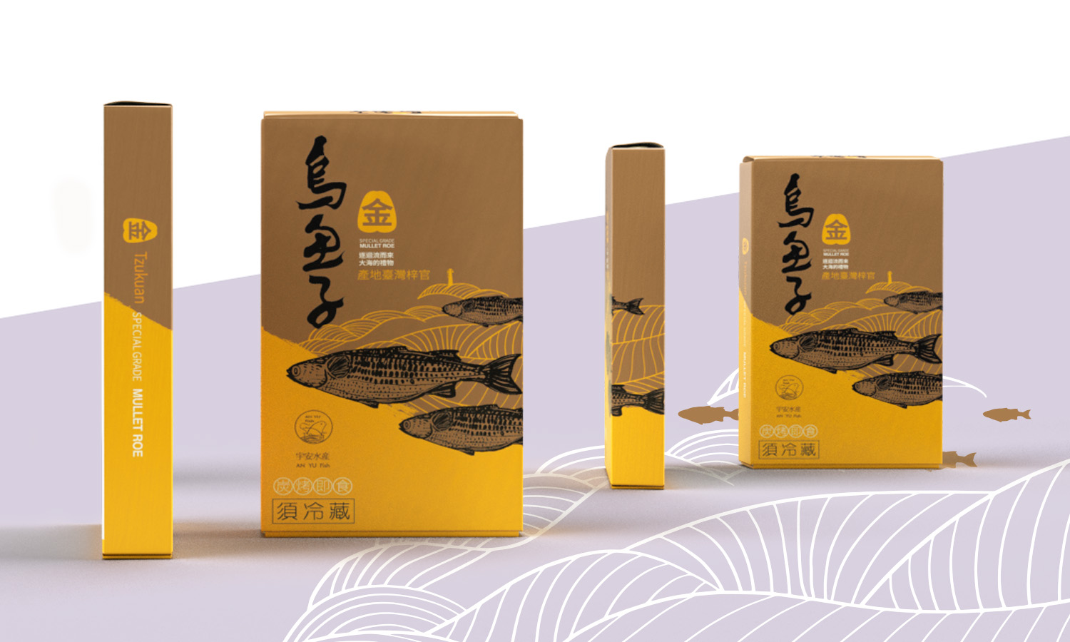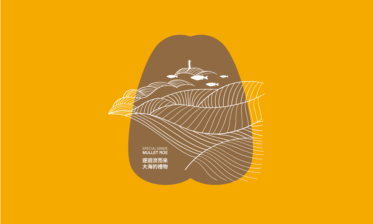 設計採用穩重的金色與大地色組合,營造出高級的質感。畫面以流線型線條與海洋元素構成動態背景,襯托著游動的烏魚群,強調烏魚子是順應自然潮汐捕撈的珍味。